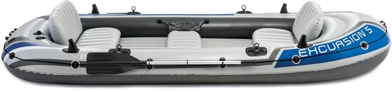 De Intex Excursion 5 is geschikt voor vijf volwassenen met een maximale belasting van 455 kilogram. De Intex Excursion 5 is uitgerust met twee quick-fill/fast-deflate ventielen voor het eenvoudig en snel opblazen/leeglaten. Verder heeft de Intex Excursion 5 Set een I-balk bodem, die zorgt voor extra comfort en stabiliteit. Ook handvatten en riemsloten zijn uiteraard voorzien. De Intex Excursion 5 weegt 26,3 kilogram.